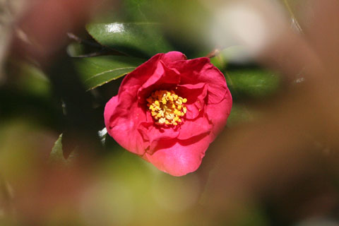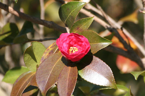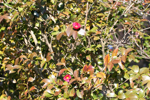 陽の当たる垣根に赤い花が咲いていました。 寒椿です。